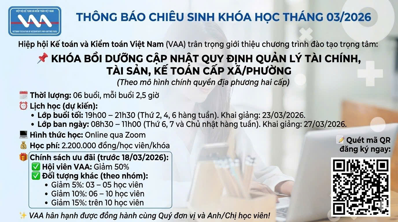 Hiệp hội Kế toán và kiểm toán Việt Nam (VAA) trân trọng kính mời Quý vị tham gia chương trình đào tạo: “BỒI DƯỠNG CẬP NHẬT CÁC QUY ĐỊNH QUẢN LÝ TÀI CHÍNH, TÀI SẢN, KẾ TOÁN CẤP XÃ/PHƯỜNG TRONG BỐI CẢNH TỔ CHỨC CHÍNH QUYỀN ĐỊA PHƯƠNG THEO MÔ HÌNH HAI CẤP” với thông tin chi tiết như sau: